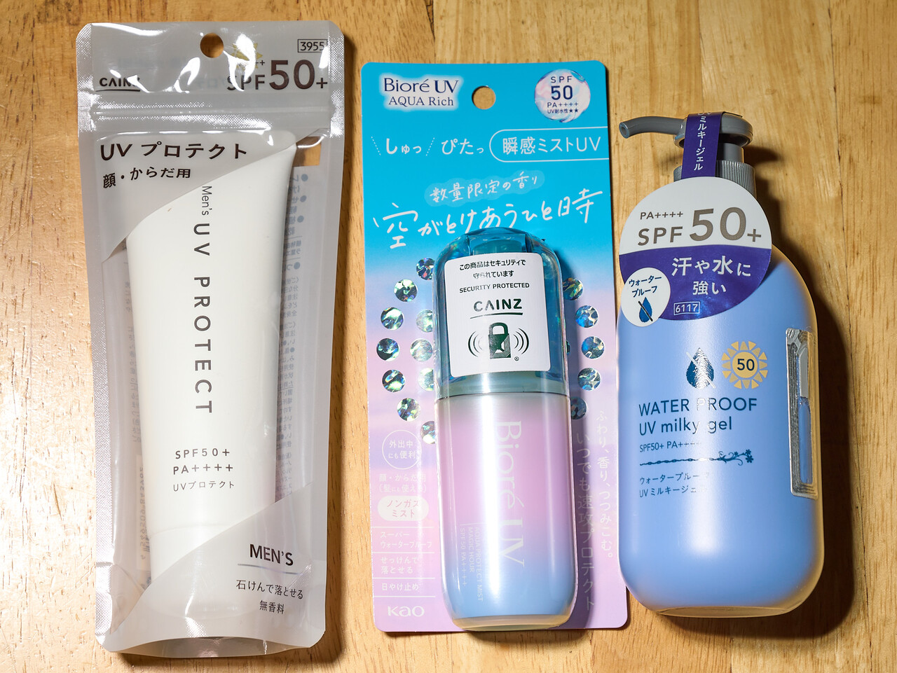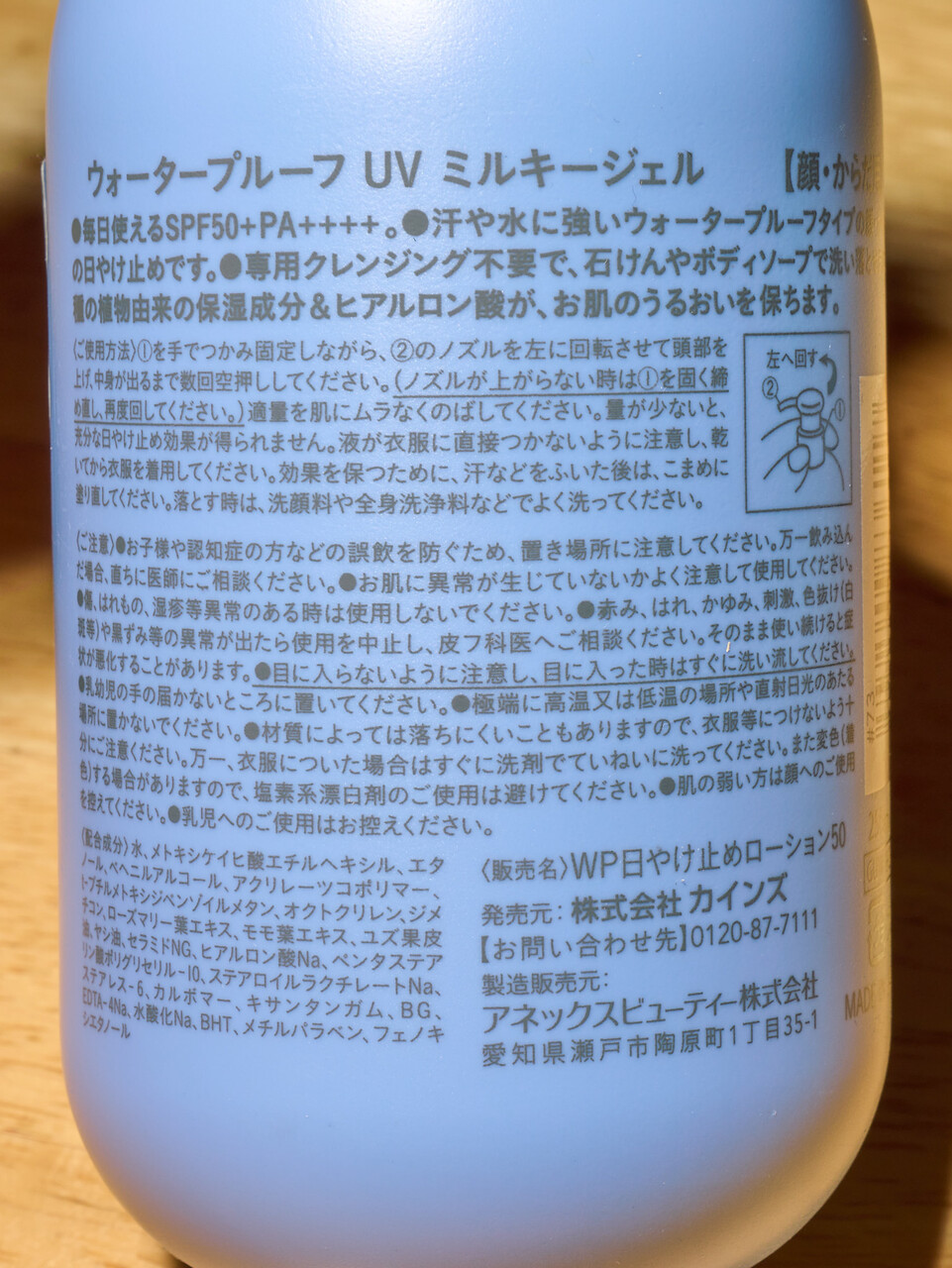 カインズ ウォータープルーフ UVミルキージェル SPF50+ PA++++ 250mlはボトルタイプでたっぷりお得感があるが実は前のチューブタイプと単価的には変わらない。こちらも同じくちょっとココナッツ系の甘い香りがする。同じく白くはならない。腕に線状に出したいときはボトルタイプは微妙な力加減ができなくて使いにくいのと、ノズルの先が皮膚に当たると痛いというものある。