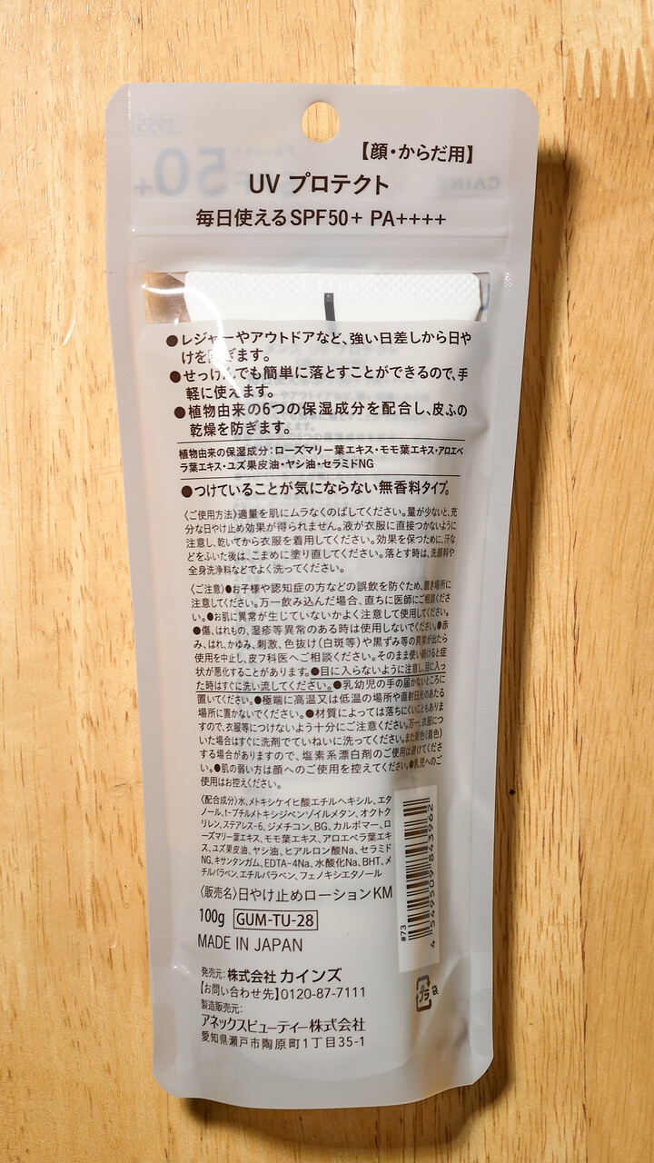 カインズ UVプロテクト SPF50+PA++++ 100gは耐水性が不明だが、シリコン系の成分が少なそうなので耐水性は期待しない方がよさそう。うっすらココナッツ系の香りがするが塗り伸ばしたら気にならなくなる。白くはならない。微妙にトーンアップするかもしれないが気のせいの範囲。