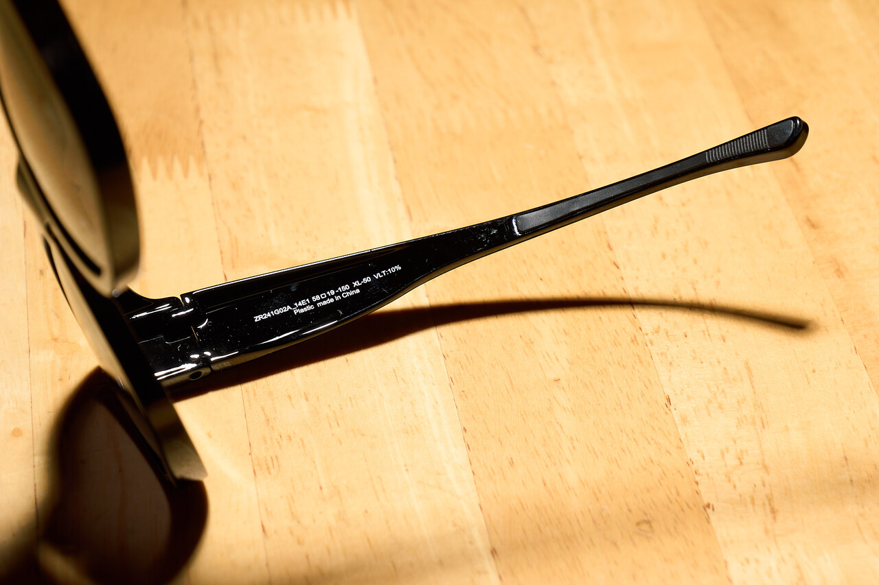 内側はこんなかんじ。ヒンジ・テンプル部分は凹形状になっている。耳に当たるところはゴムが埋め込んである。