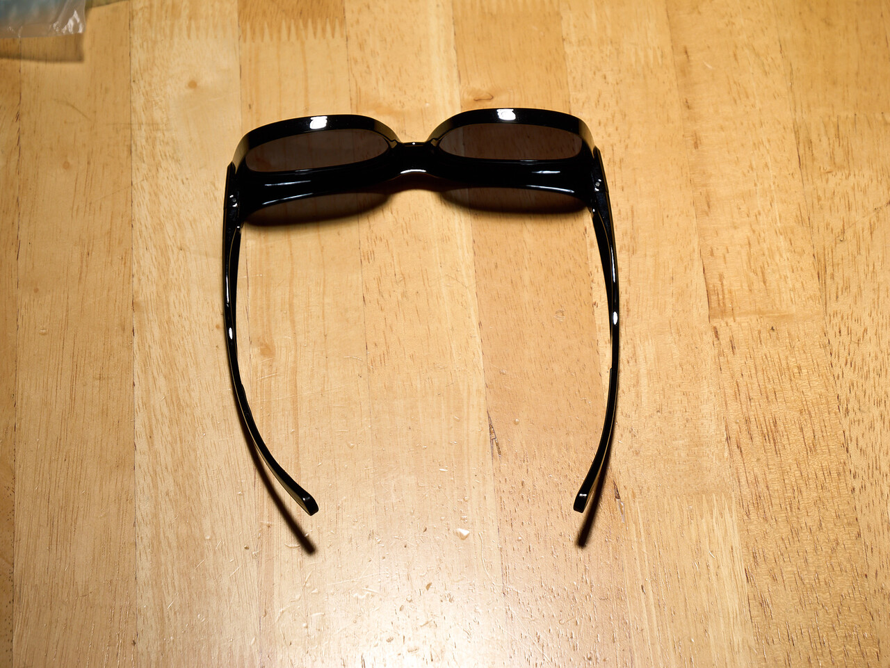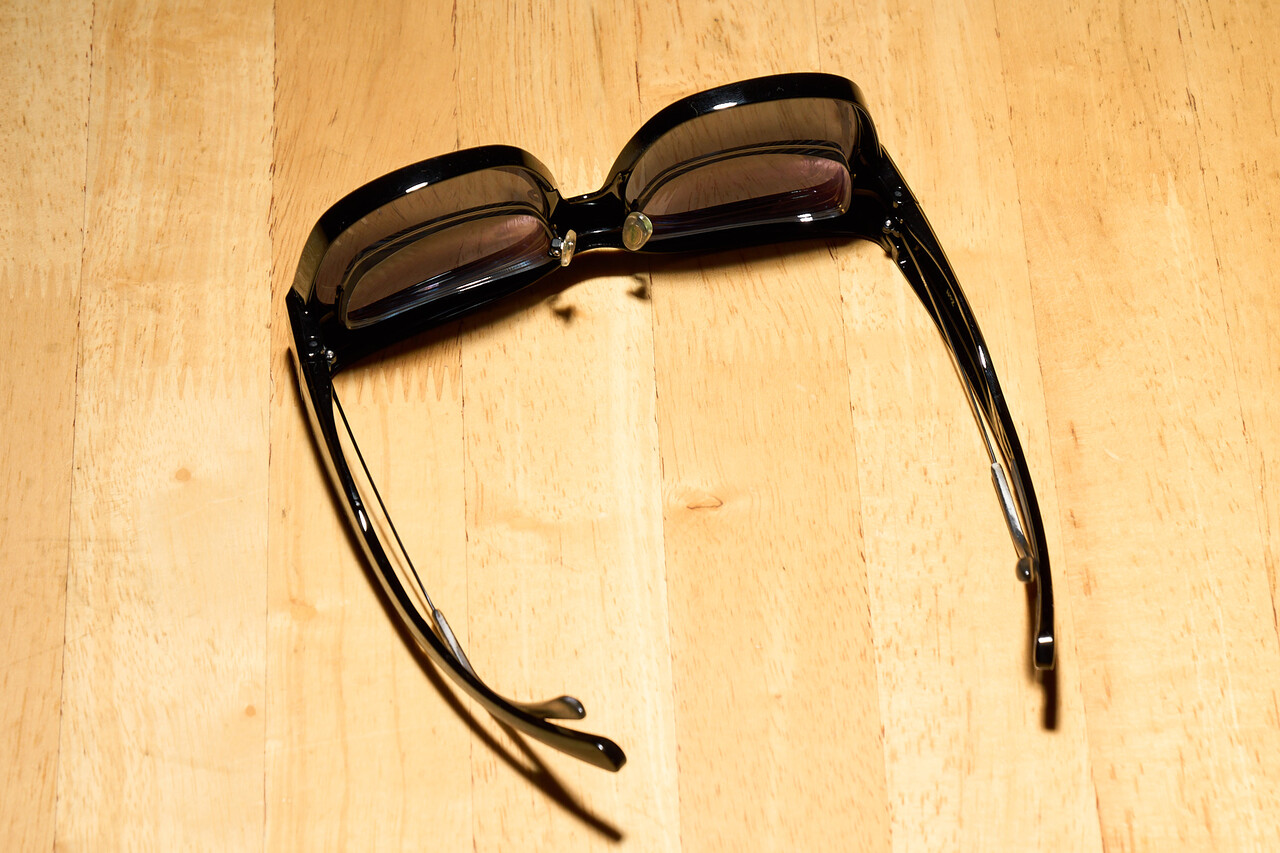 メガネのうえからサングラスをかけてみるとまぁまぁしっかりおさまってずれる感じはしない。メガネのうえにサングラスが引っかかる感じになっている。(なのでサングラスには鼻パッドがない)