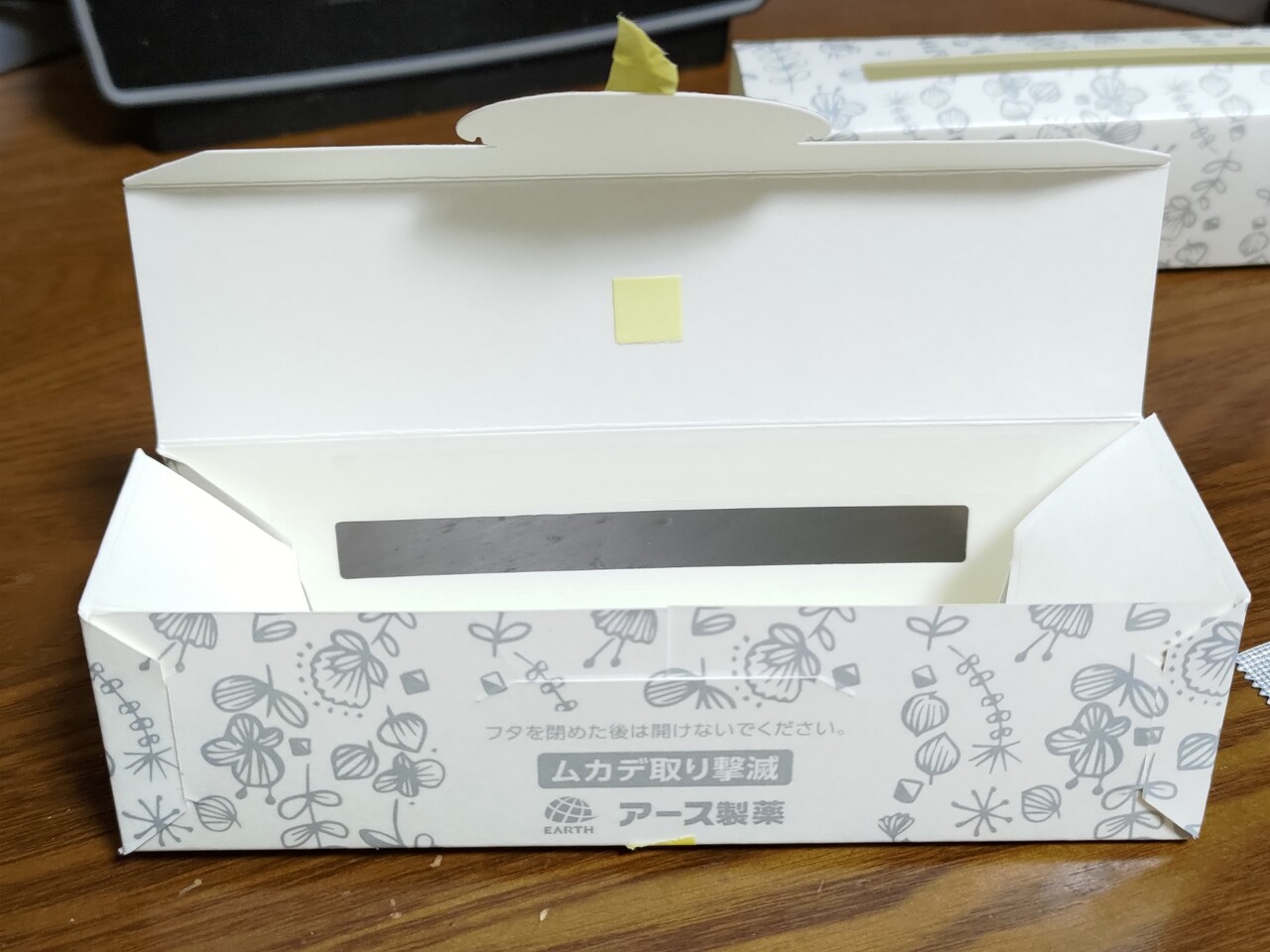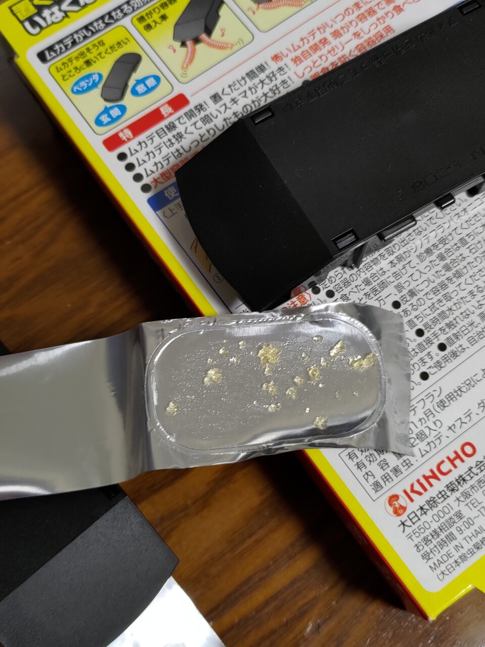 テープを引くと開封される仕組みのようだ。毒ゼリーがけっこう臭う。24時間くらいすると臭いはしなくなった。