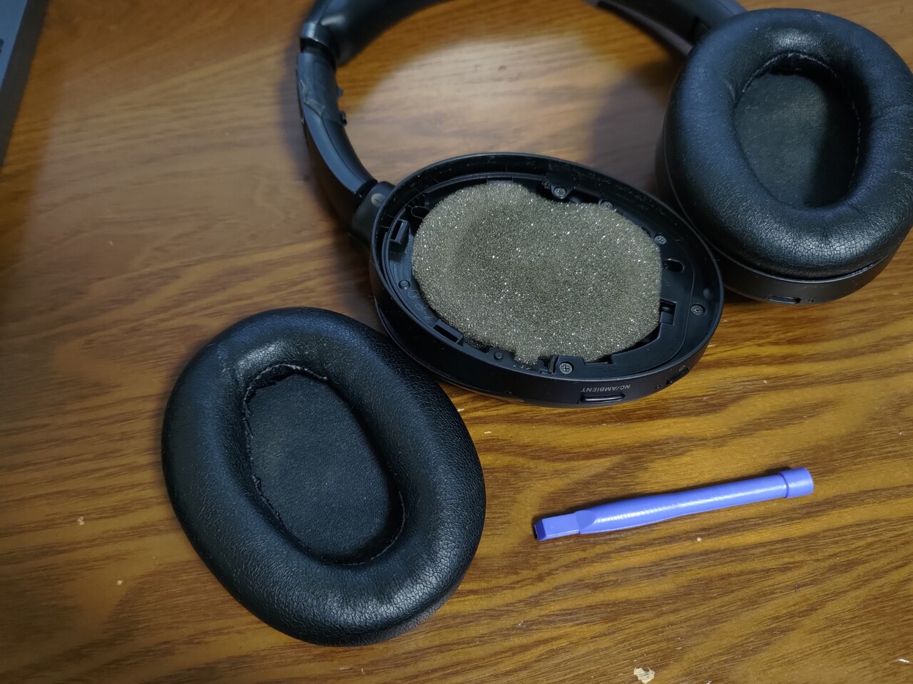 適当に治具を差し込むとイヤーパッドがひっかかっている爪の場所が目視できるので爪のそばに差し込みなおしてグリっと押すと外れて、治具をフレームにそわせてぐるっと一周すると他の爪も抵抗なくはずれた。スポンジのすぐ後ろはドライバーユニットのダイヤフラムがあって無防備な感じ。