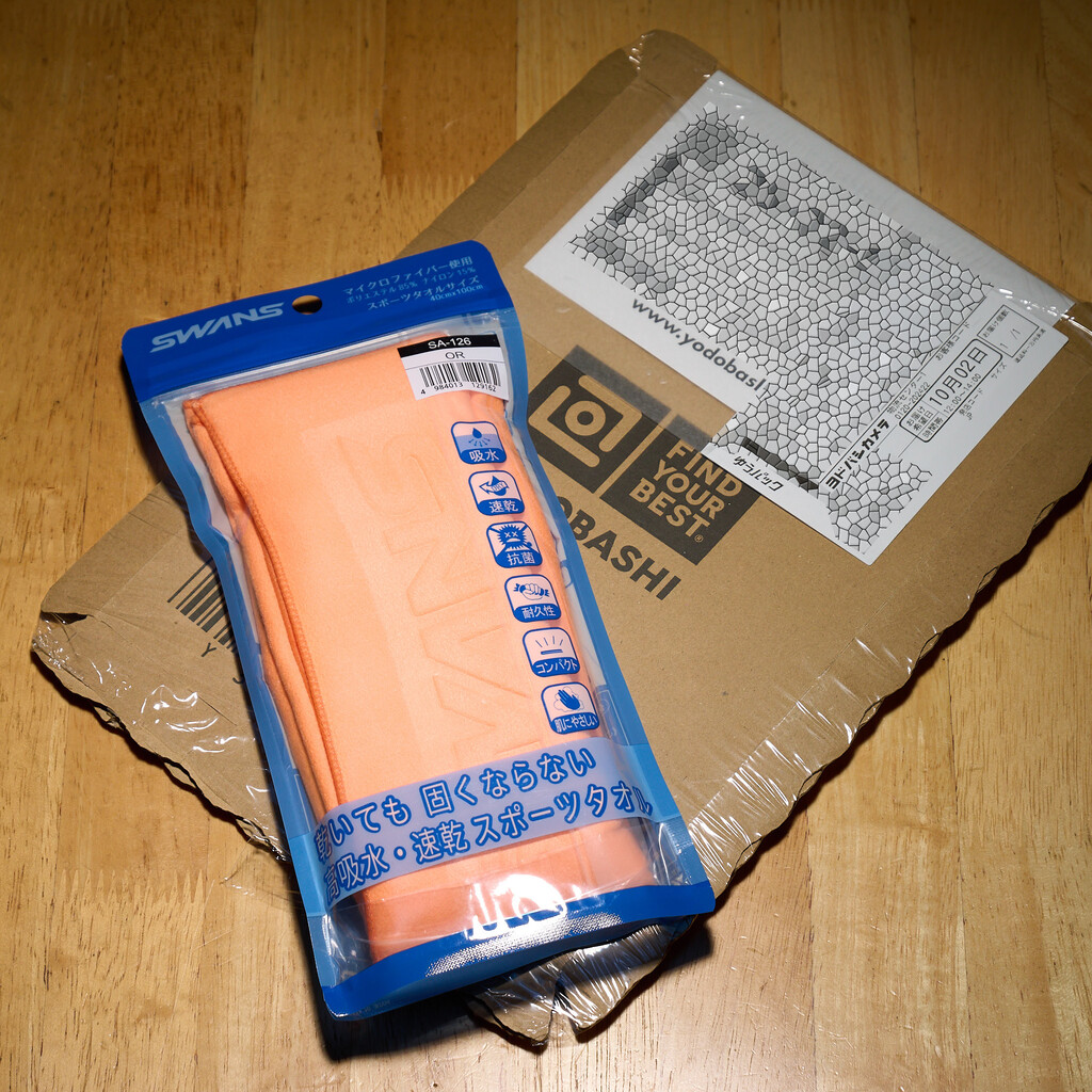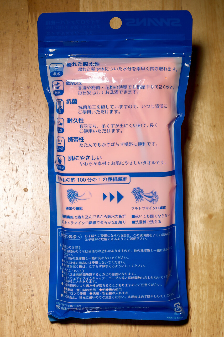 スポンジタオルは乾くと硬くなるカバンにしまうときに困るんで、マイクロファイバータオルの方が便利。あと洗濯機で洗えるのもよい。細長サイズ(40cm×100cm)なのでスポンジタオルとちがって背中を拭けるのもいい。