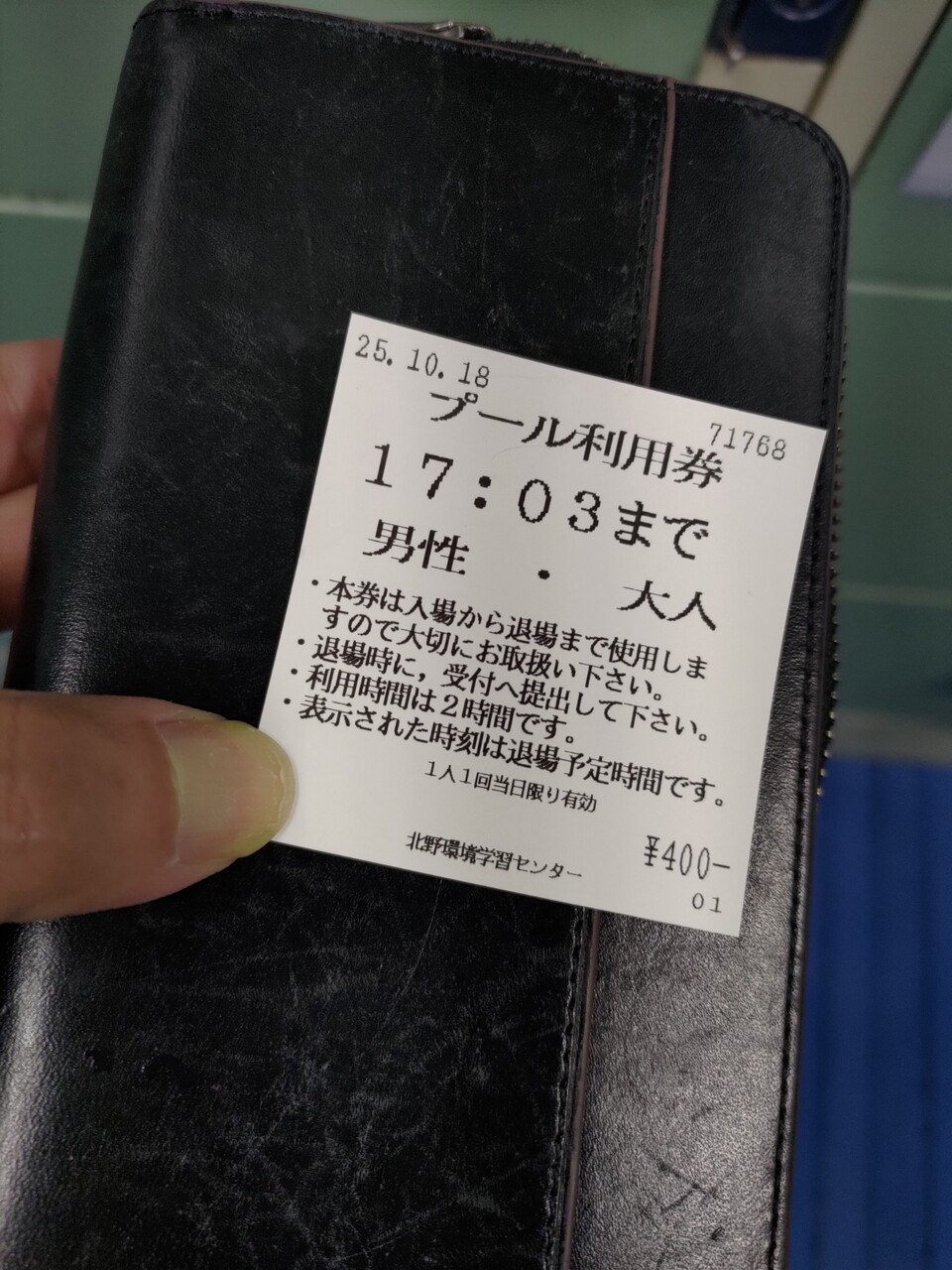 プールは4階。券売機で1時間券200円か2時間券400円を買うシステムで、退出するときに受付でチェックがはいる。水温は体感30℃くらいだったが表示は28.6℃だった。入口の下駄箱箱に靴をいれて更衣室に入る。ロッカーは100円リターン。天井が半透明の波板になっていて今日は曇りだったけど室内はあかるくて気分がよい。途中休憩の時間はないようだ。5mの旗はあるけど屋根の梁に結びつけてあるのでかなり位置が高くて視認性はいまいち。水深は1.2m。泳ぐコースが反時計回りなのは普通だけど、左側通行で追い越しは右からというのはめずらしい。