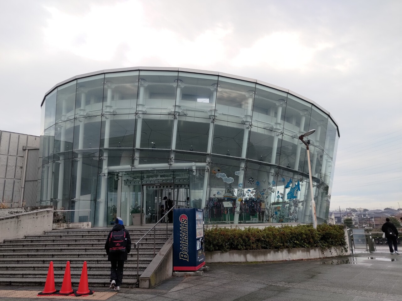 観覧席の座席が少ないので体育館が控室になってたようだ。観覧席から体育館に移動するにもいちいちプールサイドをとおらないといけないのはいまいち。観覧席から更衣室に行くにはプールサイドをとおって階段を降りていく動線になっていていまいち。