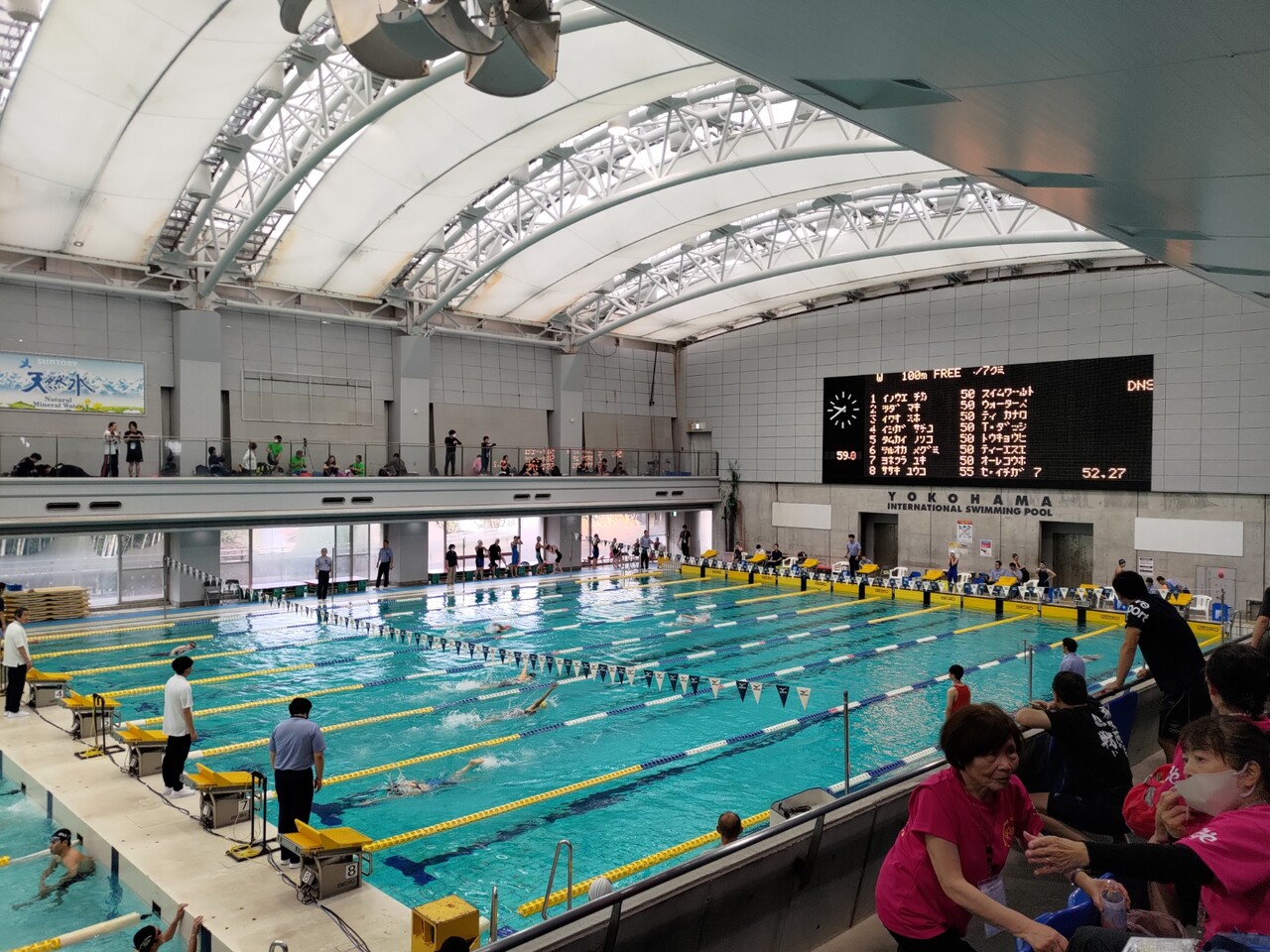 朝の出発準備に時間がかかってしまい予定より1本遅れの電車で横浜国際プールへ。サブプールでレースは初めてかも。今日は天気がよくなかったが、行き帰りともに雨に降られずたすかった。