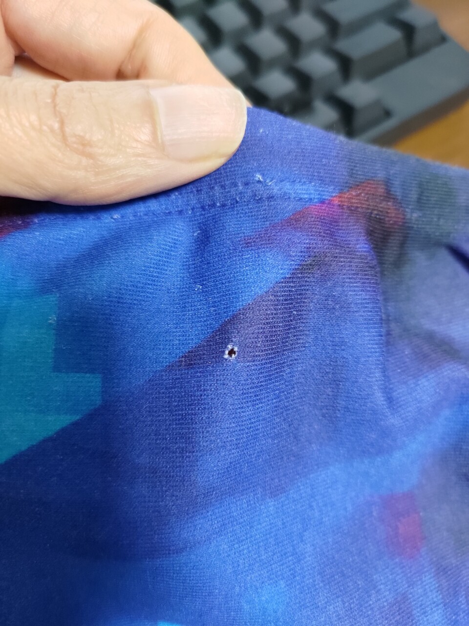 縫い糸が切れて穴が開いてるけど、かろうじて縫い代で隠れてる。裾の糸もボロボロなので完全に寿命。