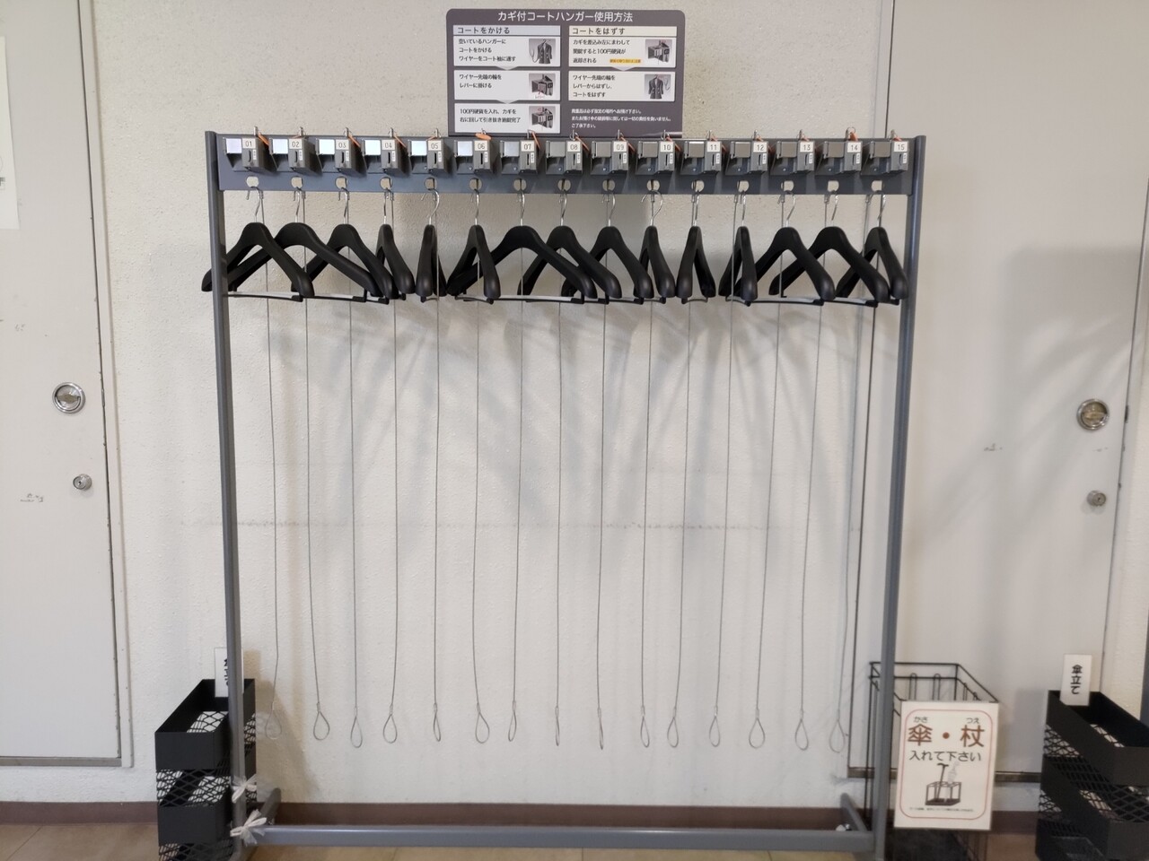 ロッカーは小さめなので入口にコート掛けが置いてあった。