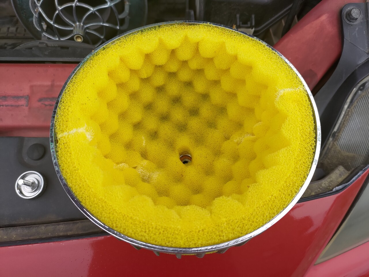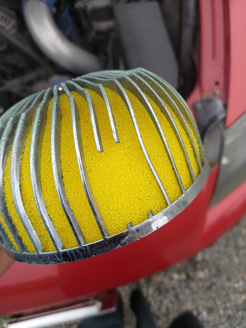 古いスポンジをはずしたら過去のボロボロスポンジがくっついてた。販売店はこのボロボロスポンジ状態でエンジン回したわけで、おそろしい。