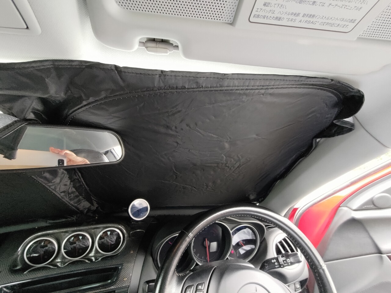 サイズぴったり。サンシェードはダッシュボードとAピラーに引っかかって固定できる。上側はフリー状態。ルームミラーは運転席側に1cmくらいオフセットして取り付けられているようで、ちょうどセンターに切り込みが入っているサンシェードとは位置が合ってないが、このくらいなら問題ないかな。
