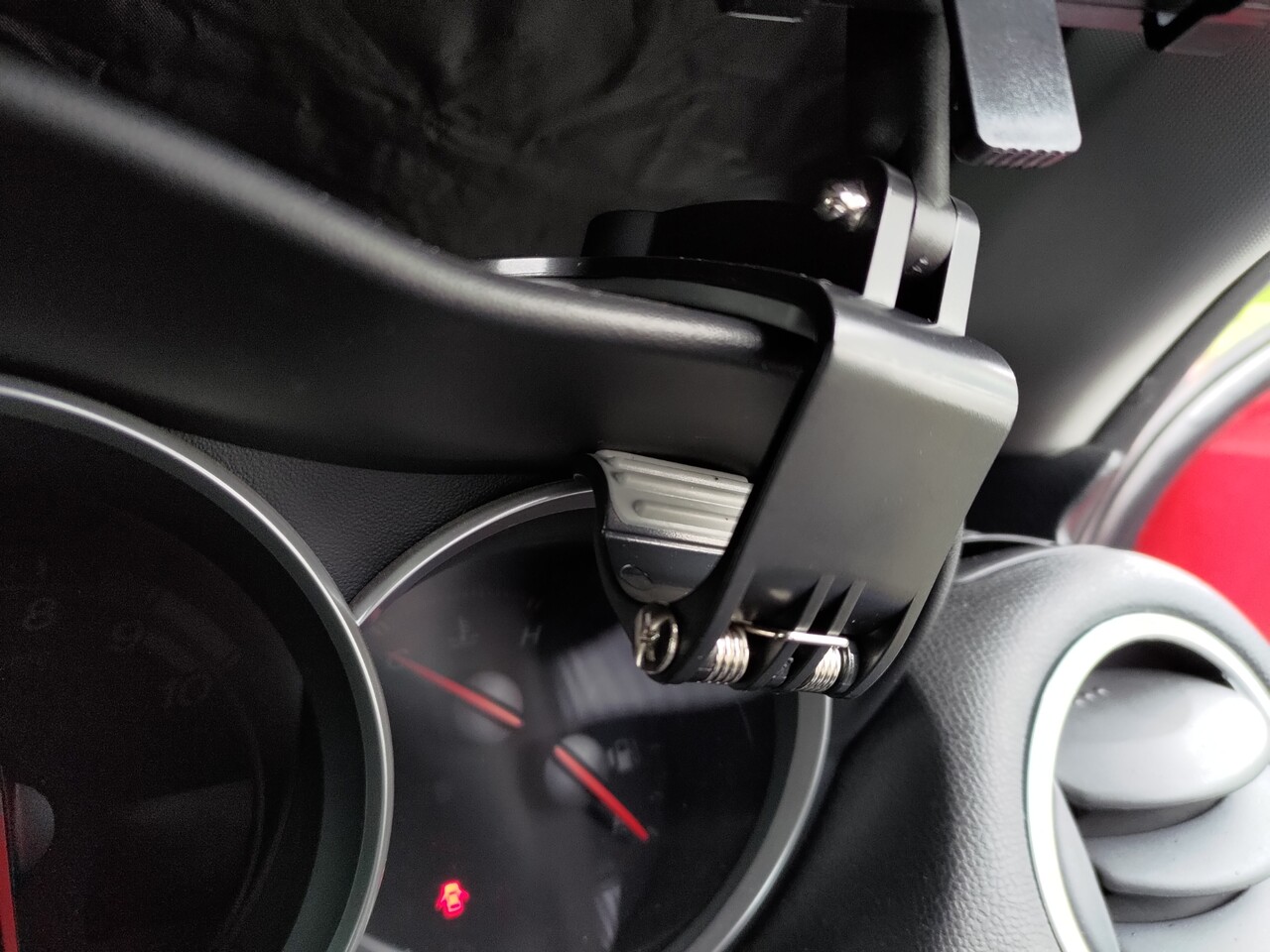 シフトレバーの後ろあたりのセンタートンネル部分に取り付けてたIPOW ゲル吸盤式スマートフォン車載ホルダー 360度回転可能 ダブルクリップ(ブラック+レッド)(1550円)、取れないしズレないし性能は問題ないけど、スマホの位置がかなり低いので運転中にチラ見するのがかなりむつかしい。吸盤を張り付ける位置はダッシュボード左側はエアバッグがあるしセンターはdefi3連メーターがいるしその右側だとハンドル操作のときに手がぶつかるのでダメで、ほかにいい場所がない。