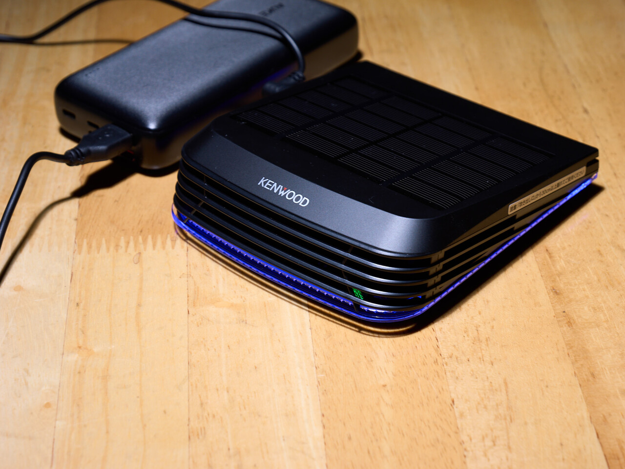 モバイルバッテリにつないで給電すると青色のイルミネーション用LEDと電源用の緑色LEDが点灯する。
