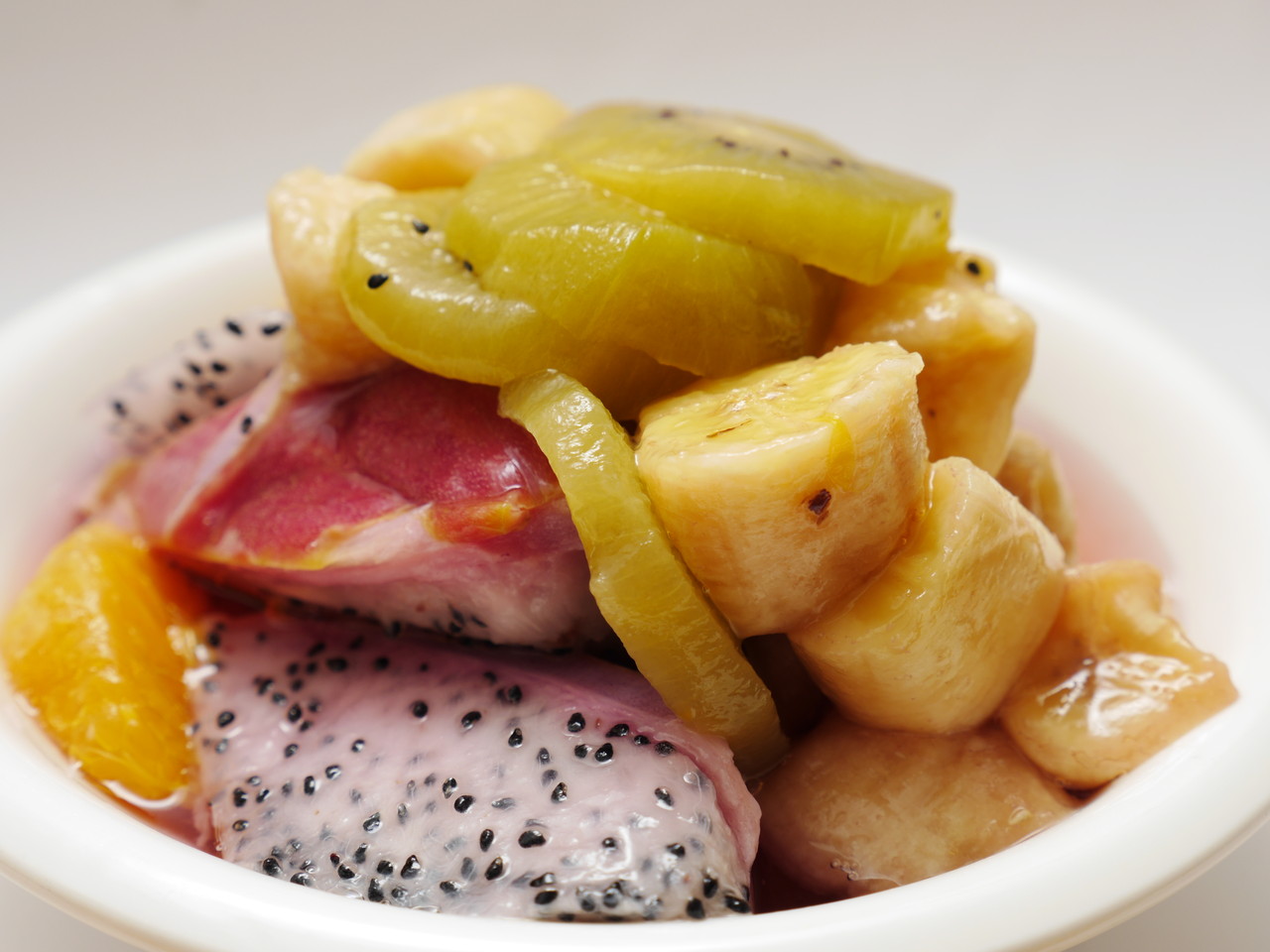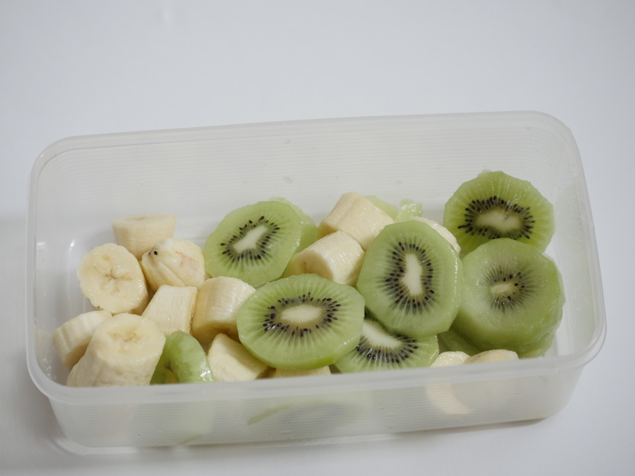 空腹時に買い物すると買いすぎてしまうというアレのため、果物を刻んでビンにつめてみたら完全にオーバーフローした。しかたないのでリンゴとオレンジはビンで