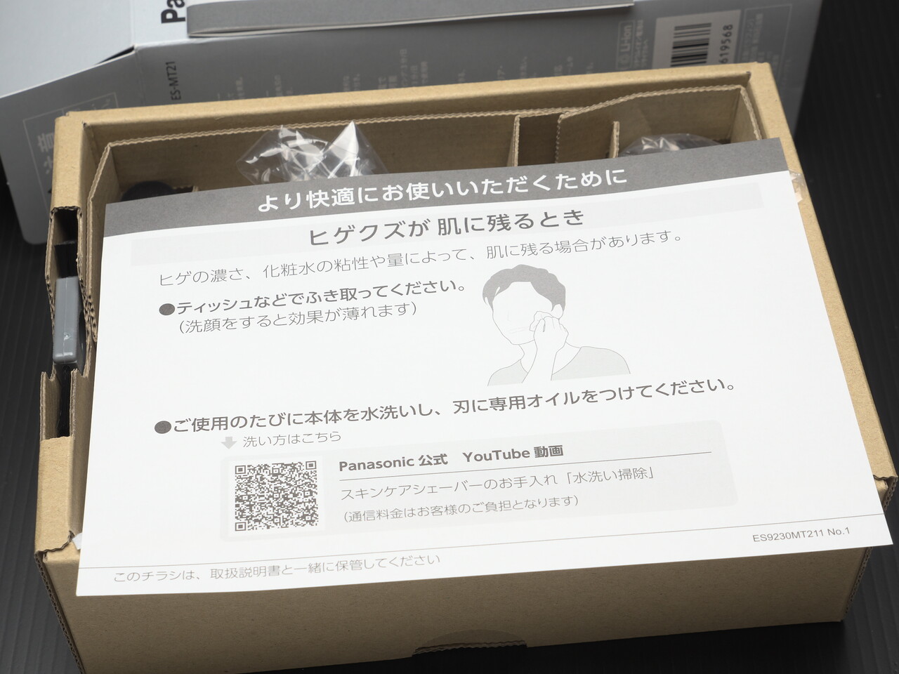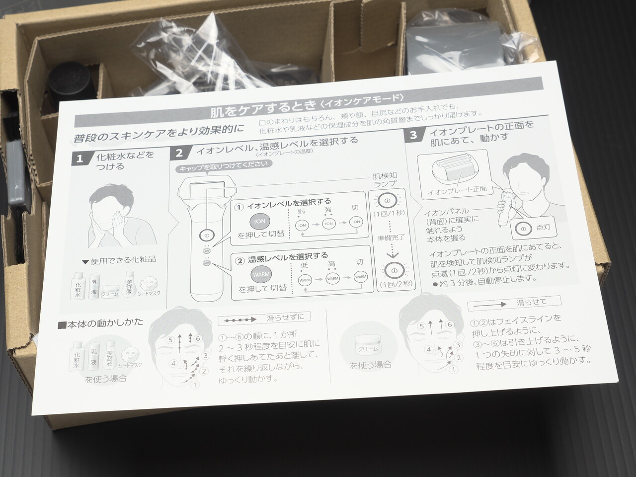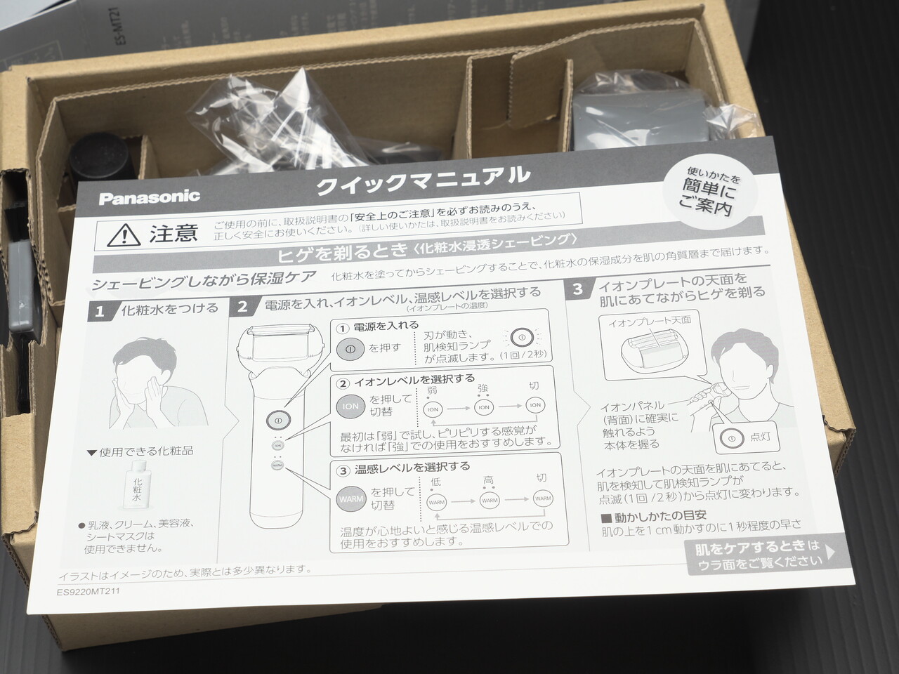 さらに開封。説明書・クイックマニュアル・チラシが上にのっていた。このチラシにも書いてあるけど化粧水をつけてイオン導入しながら髭剃りすると髭クズが顔にくっつくのでサラサラタイプの化粧水を使うべきなんだろうな。