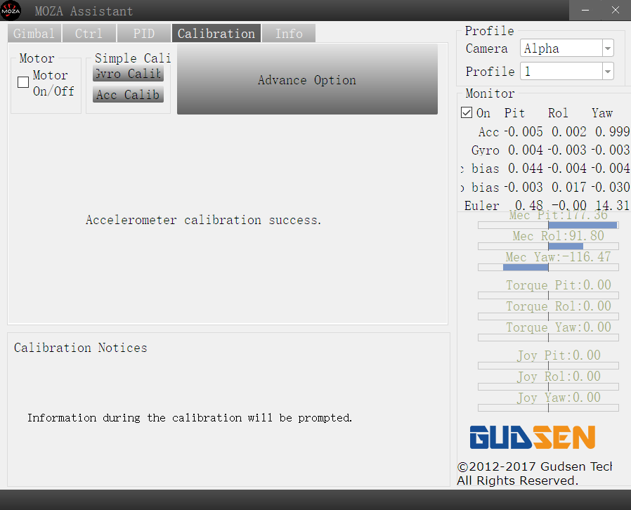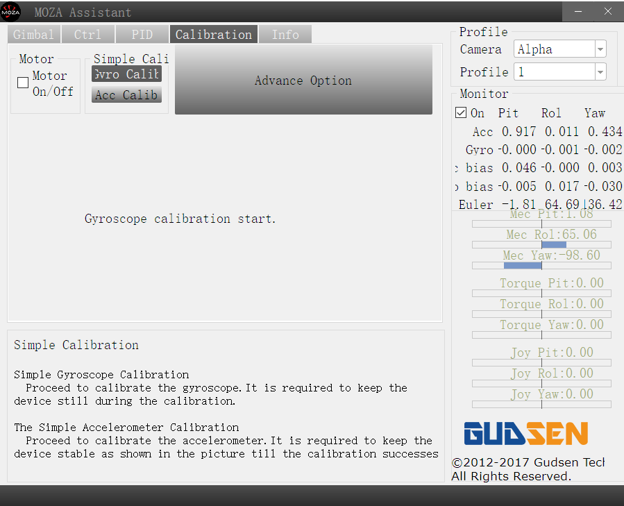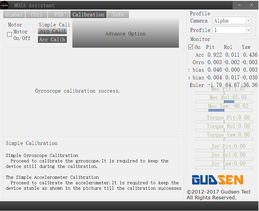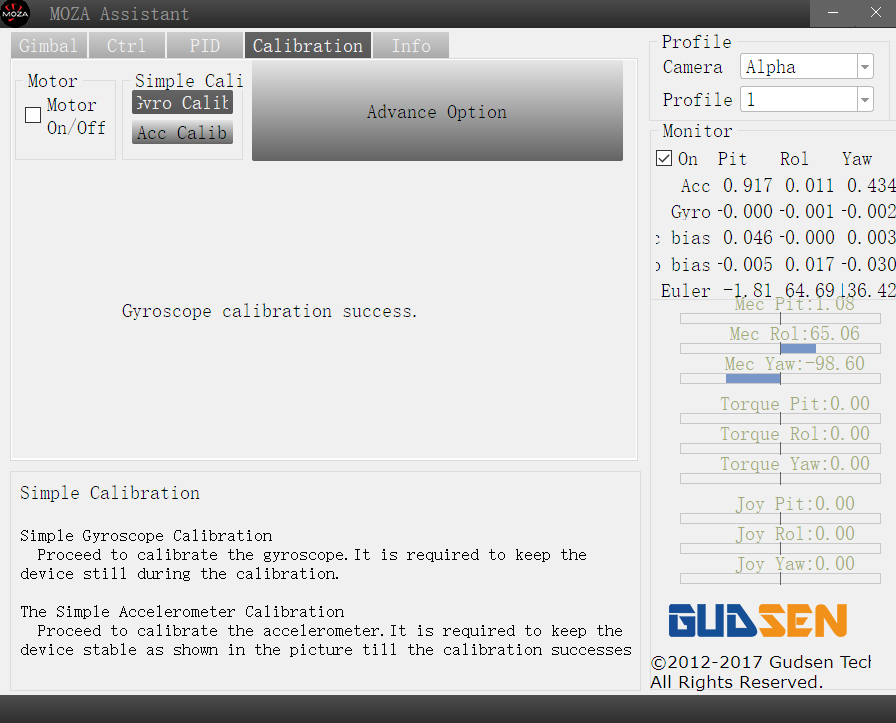 Gyroscope Calibratonボタンをクリックして開始。1秒くらいで終わってしまったが、ちゃんと校正されたんだろうか?心配