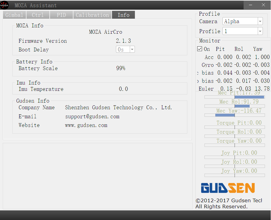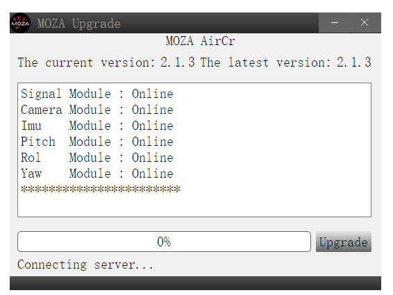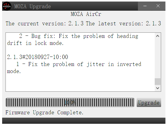 PCとジンバルをUSBでつないで、ジョイスティックを押しながら電源onでファームウェアアップデートモードに。upgradeを押すとアップデートがはじまる。