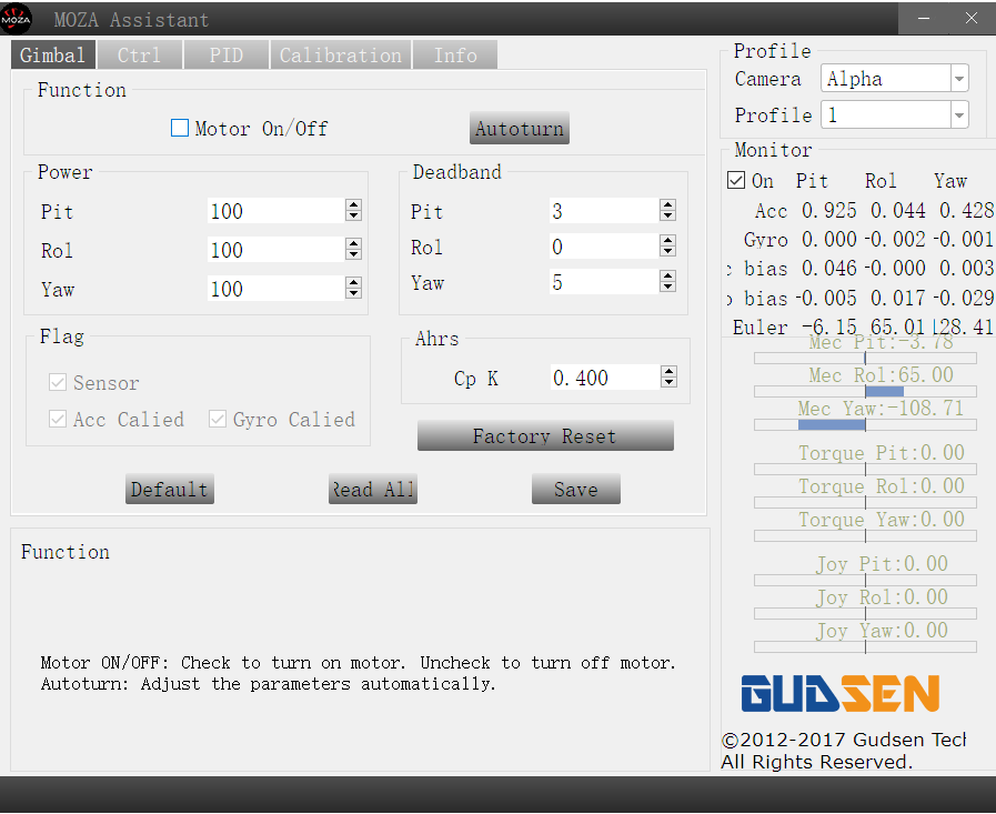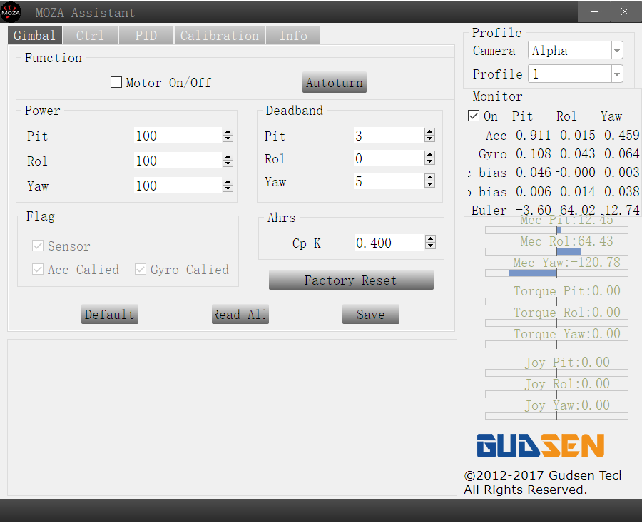 ジンバルをふつうに起動する。このときカメラが載ってないとジンバルがあばれるので注意。壊れるかどうかはわからないけど、過負荷がかかると言っている人もいるのでカメラをつけておいた方がよさそう。