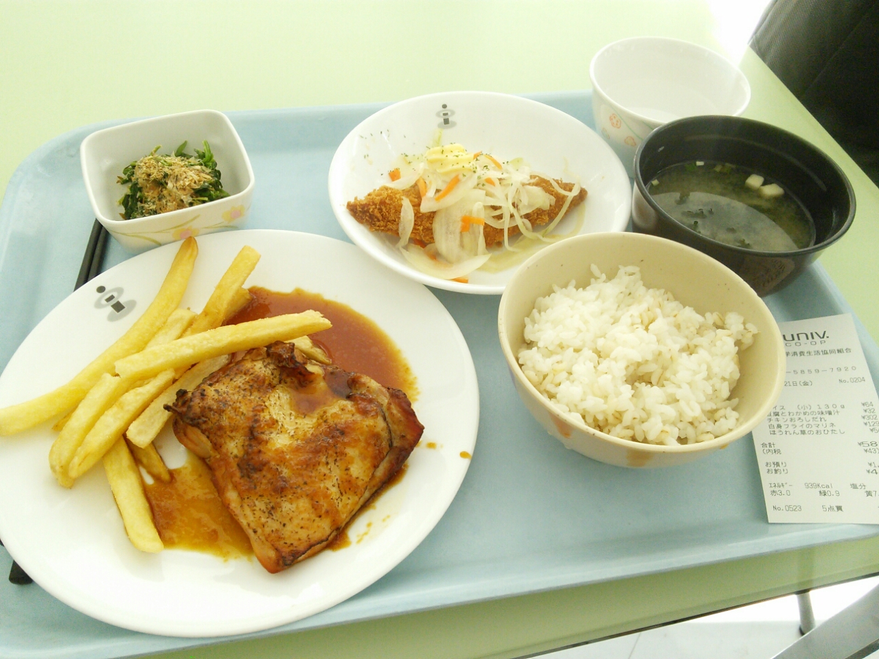 1時間前に着いたので食堂「プラザ憩い」で日替わりランチ(590円)。混雑してるかとおもったら案外空いてた。食べおわったあと、となりの食堂「カフェテリア」をみにいってみたらこっちは行列ができるくらい混んでた。ぱっとメニューをみたかんじこっちの方がボリュームがあるからかな。