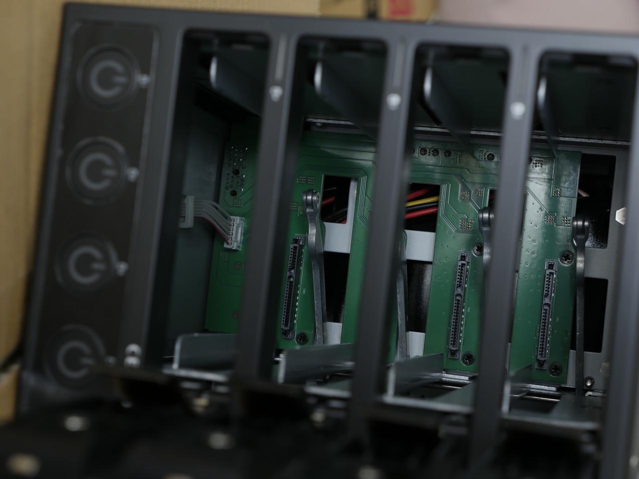 1UサーバなんかのHDDドアにくらべると、裸族のはちょっと剛性感がない(ぺらい感じ)がするが大丈夫だろうたぶん。