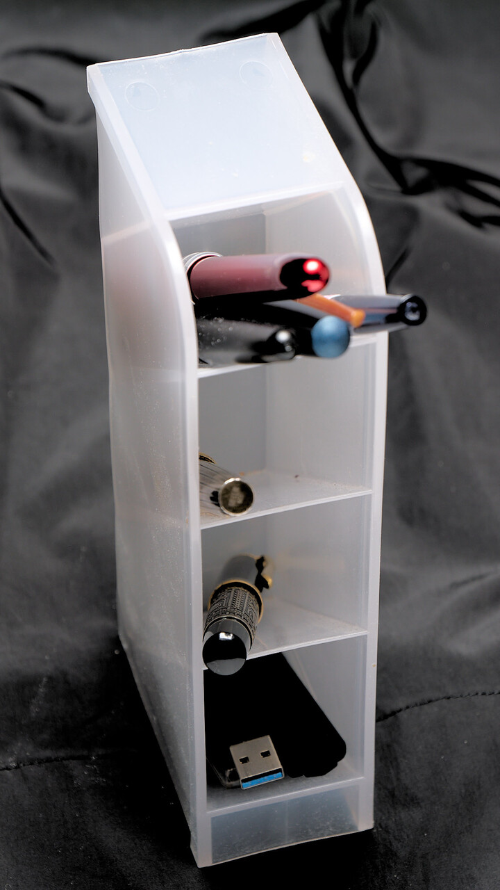 いちばん下の段は奥行きがないので時計置き場に。下から2段目も9mmくらい奥行きが狭かったが万年筆に太さがあるので違いは問題にならず。