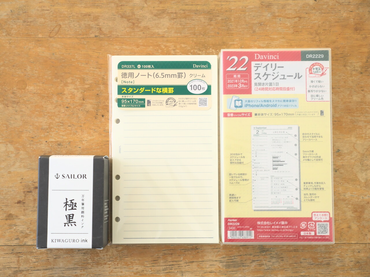 毎年買っているレイメイ藤井の片面1日のシステム手帳リフィルかった。送料無料のために罫線ノートとセーラーの極黒(きわぐろ)もかってみた。