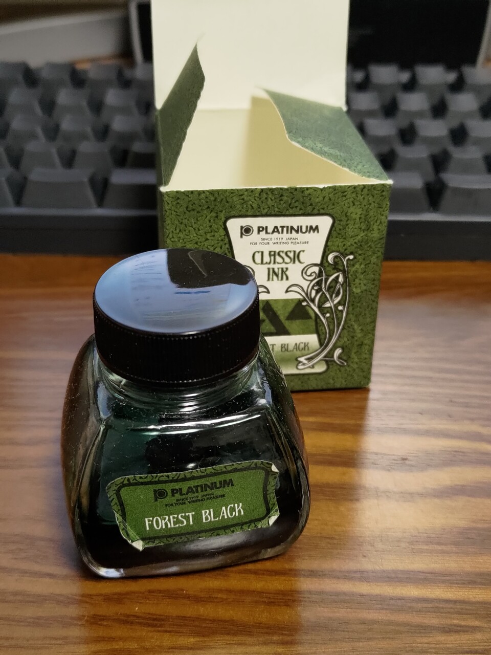 プラチナクラシックインクはボトルにリザーバーがついているのがよいが、ボトルはレトロ調でラベルははがれてきていて骨董品感を醸し出している。