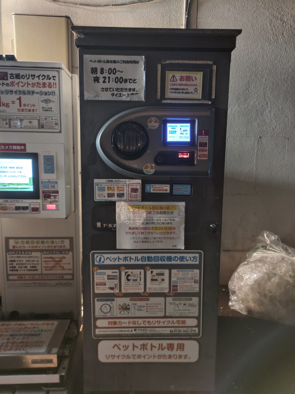 ペットボトル回収機はたいしたポイントにはならないが、家にペットボトルをためると場所をとるしゴミ袋も必要になるので便利に使ってたが2/22で終了。