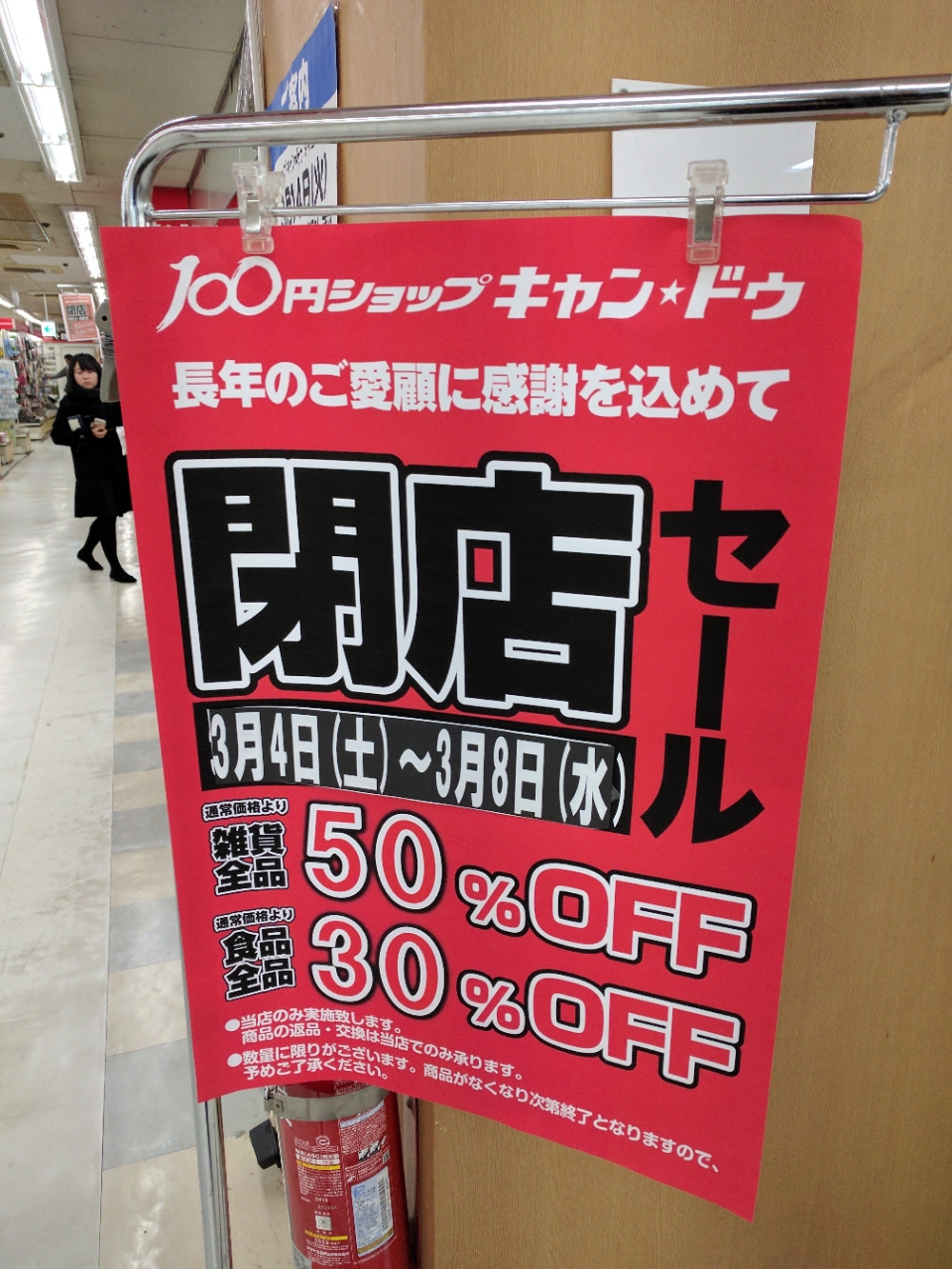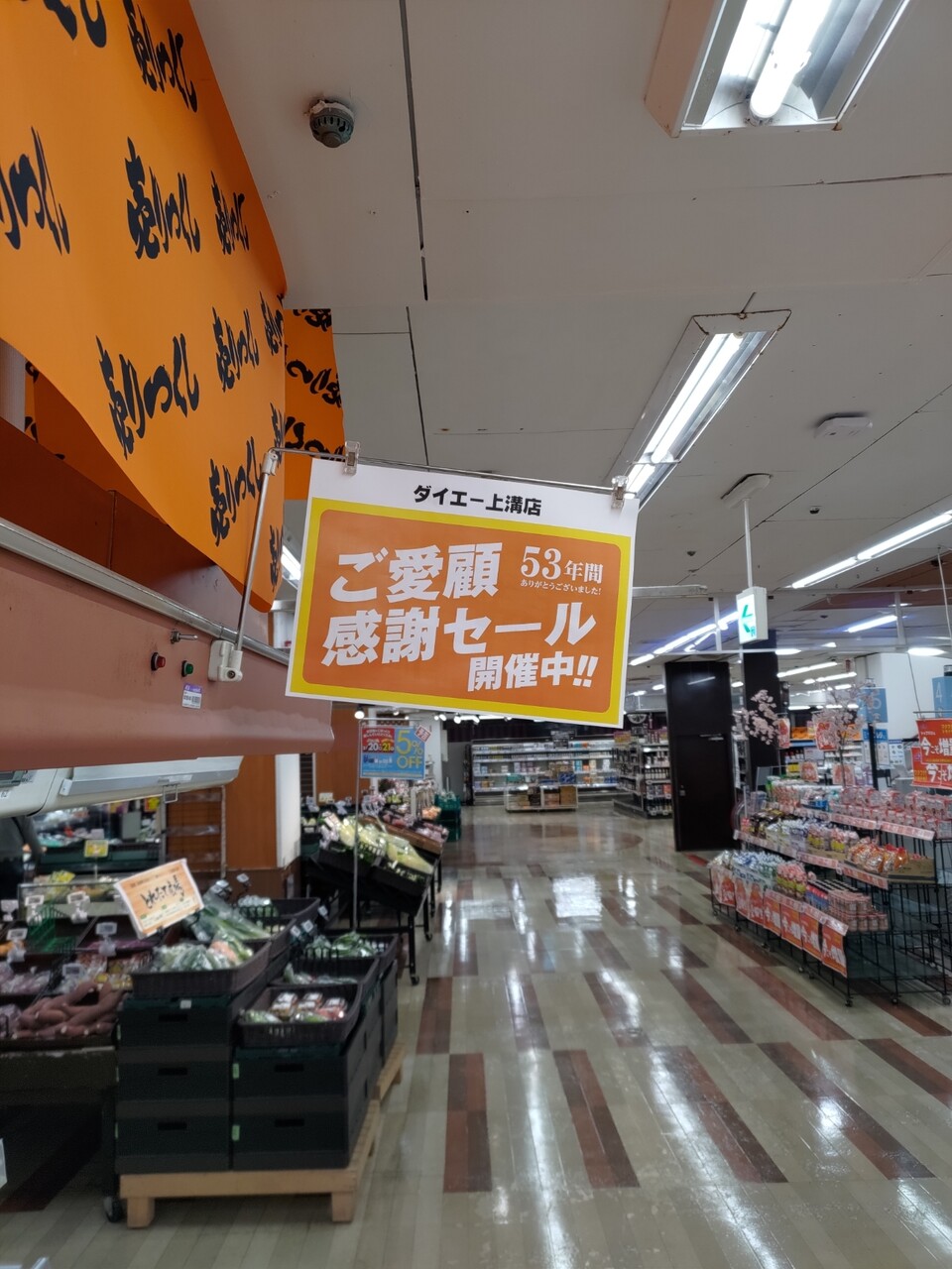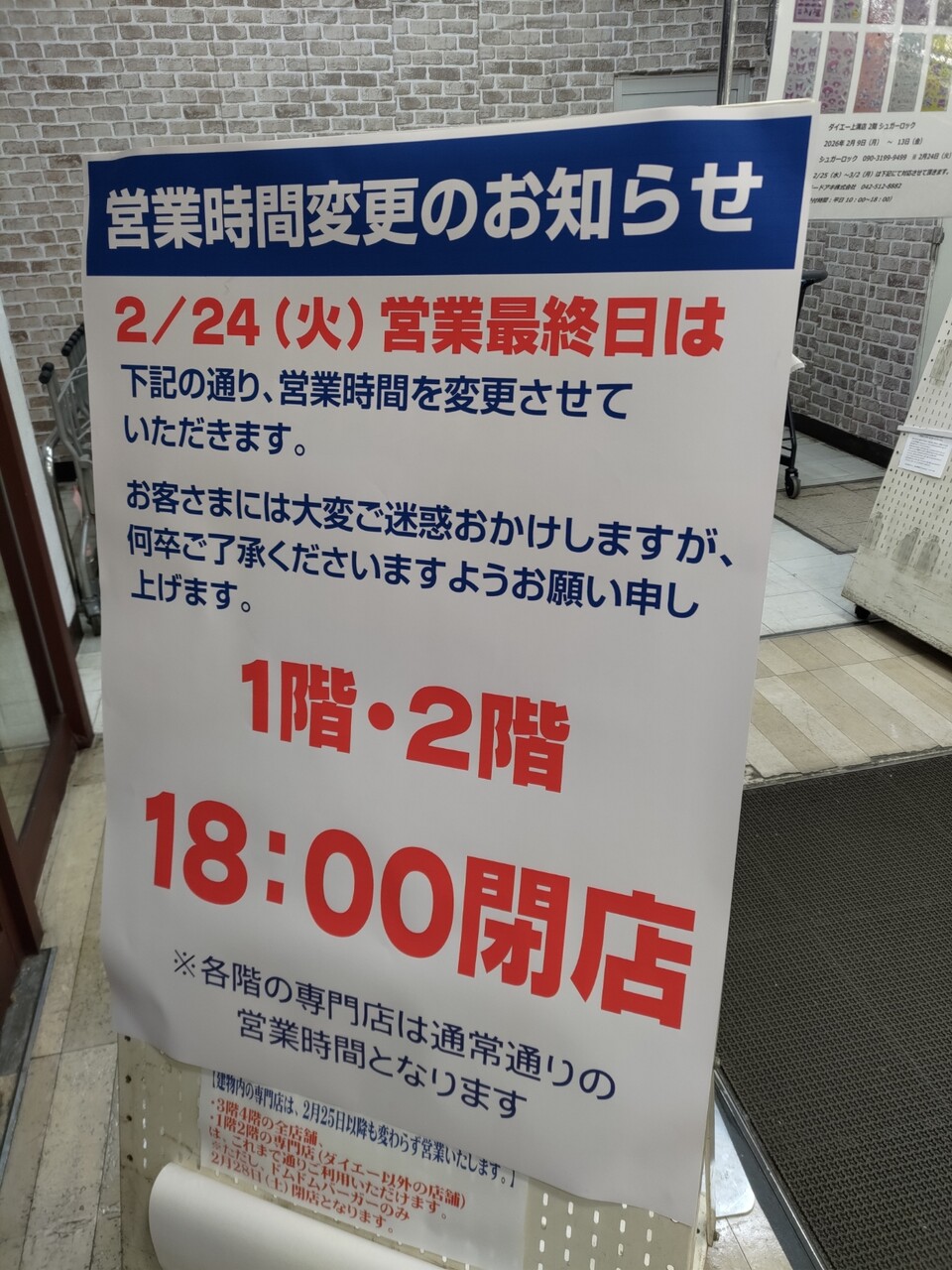 2階の衣料品家庭用品はかなり前から売りつくしセールをやっていたが、ついに1階もセールが始まり2026-02-24閉店の立て札が出た。