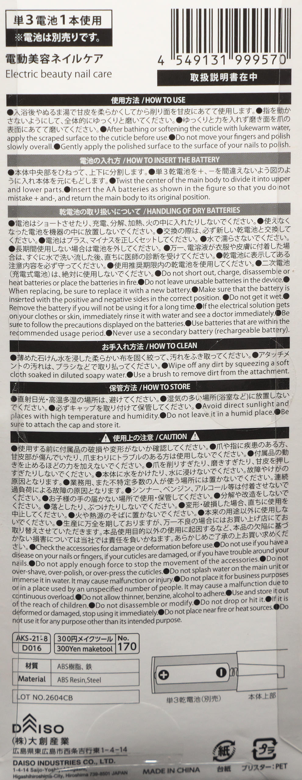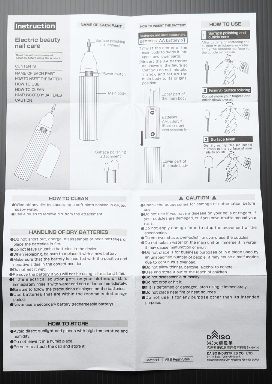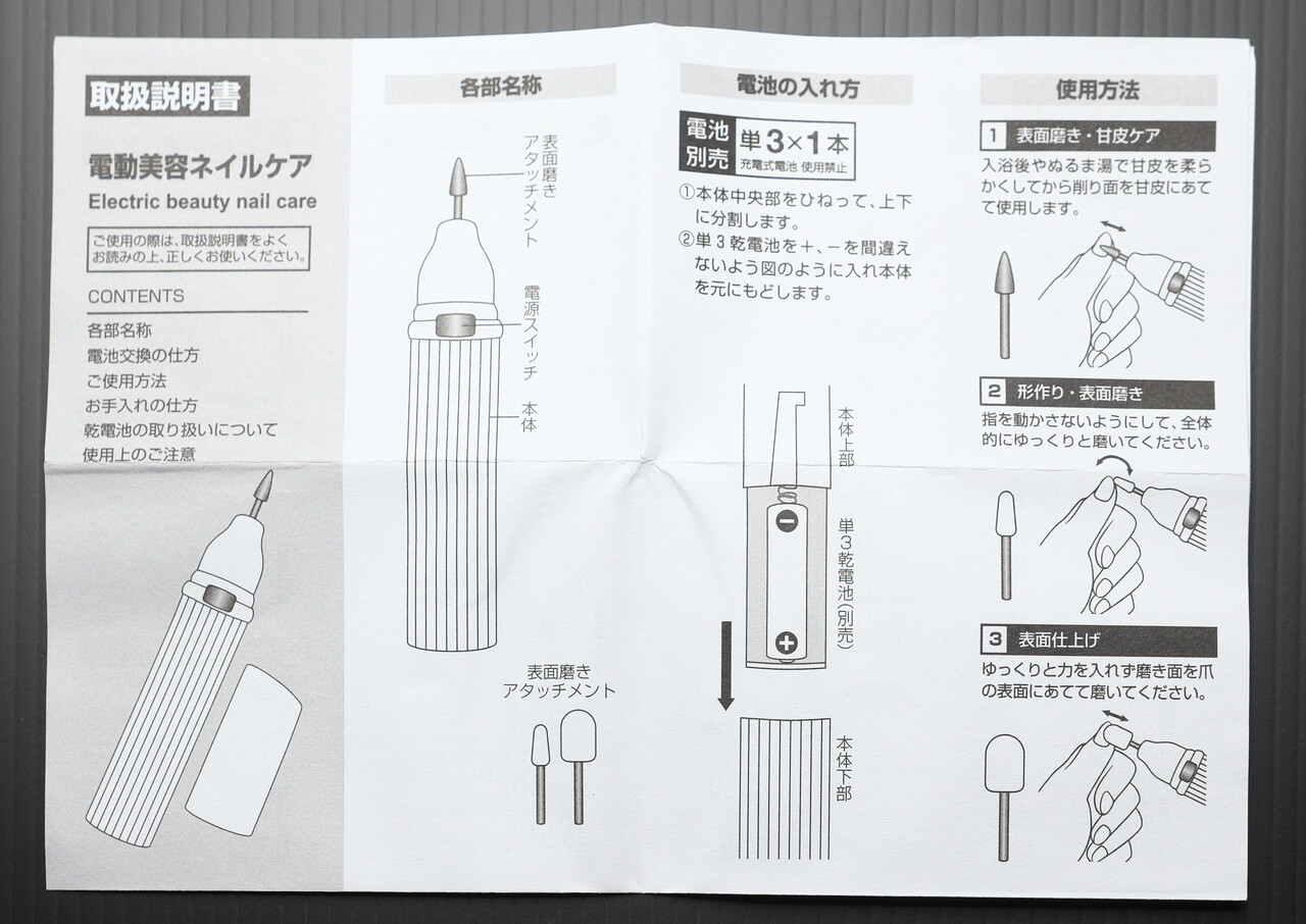 ダイソーでうっている300円のネイルマシンがまあまあつかえるみたいなので買ってみた。ジェルネイルオフを削るのが大変なので楽になるといいなと思って。店頭でみたらロット番号が2012CBと2604CBの2つがあったが、なんとなく番号が大きい方があたらしいだろうという考え。番号が大きい方が台紙も本体も白っぽくて新しい感じもしたし(本当のところはわからん)。