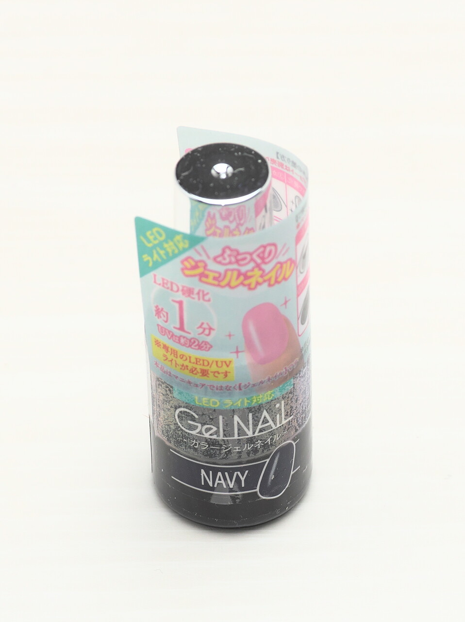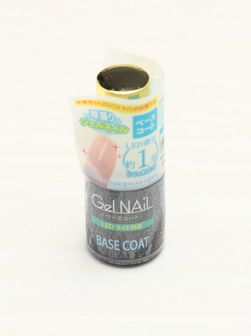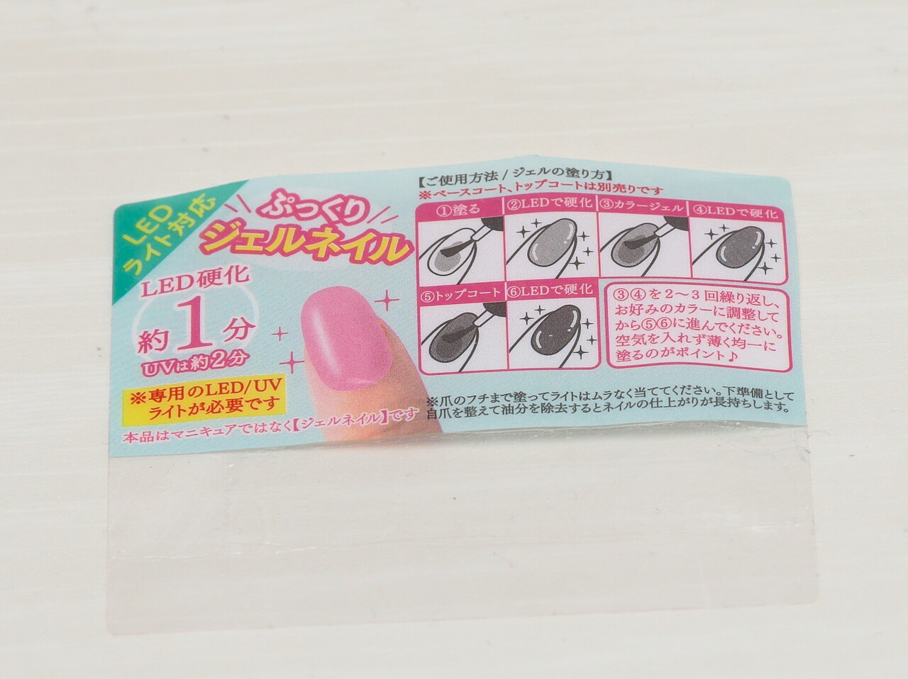硬化時間はLEDで1分と書かれているが光源の強さとか爪までの距離に依存するよなぁとおもいながらも、キャンドゥのLEDランプで60秒で固まった。表面は未硬化ジェルでベトベト。