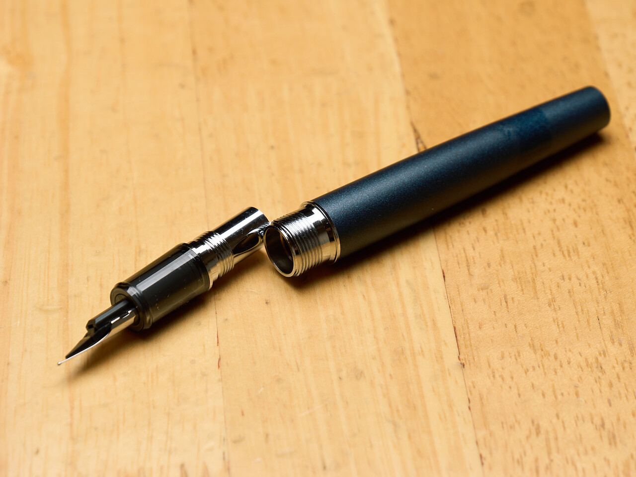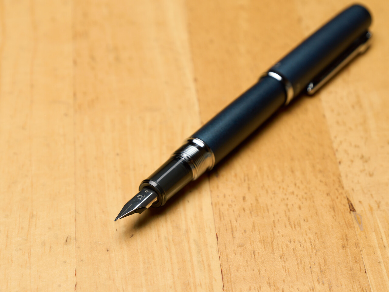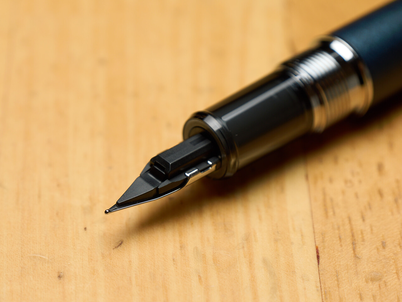 プレジールのペン先は短くて寸胴なかんじだが、プロシオンは細長め。ペン芯にはインクを吸い上げるためのスリット状の穴があいていて、インクボトルから吸い上げやすいようになっているそう。ペン先が乾いてきたときとかインクフローどばどばで書きたいときにコンバーターのピストンをちょっと押し下げてペン先にインクをたっぷり含ませる使い方をするときがあるのだが、この穴からインクが滴ってきて、個人的にはちょっとつかいにくい構造かな。
